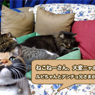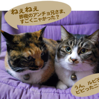 それは、昨日の夜のことでした。 ビビ子ちゃんに呼ばれて、ソファーを見てみると、あら、大変!ルビ子ちゃんとアンチョくんが、仲よく猫ベッドにはいっているじゃあーりませんか!!! ルビちゃんとビビちゃんは姉妹なので、よくいっしょにくっついて寝ておりますが、アンチョ先生が添い寝をするのは、ねこねーさんだけ。...